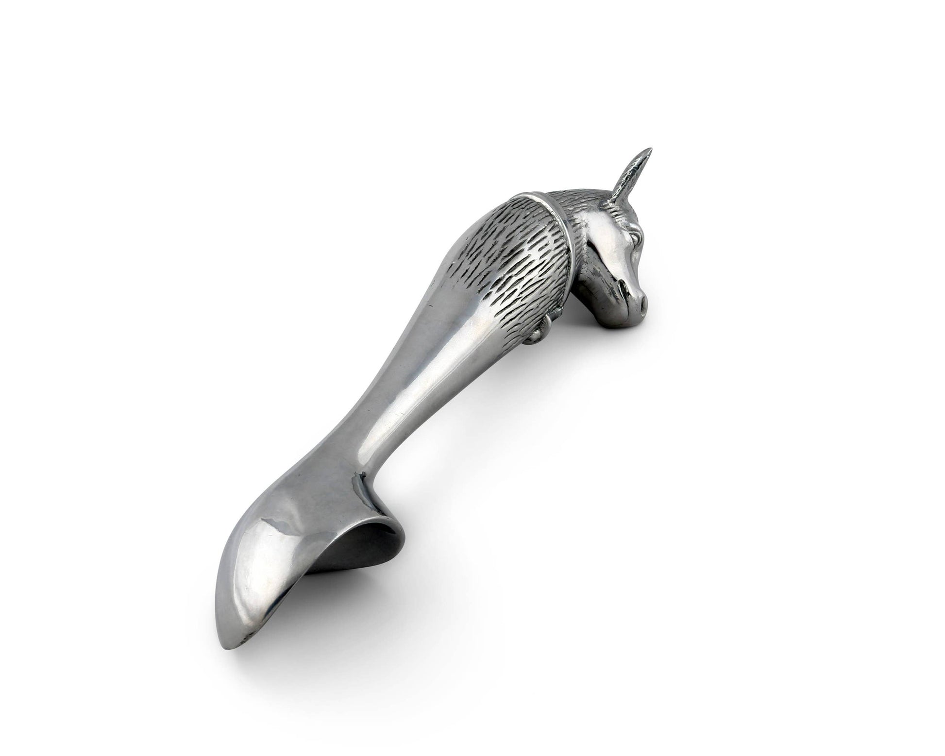 Watch the adorable farm animal in Arthur Court's Cow Ice Cream Scoop steal the show at your next party! A cow head adorns the end of this piece as its big ears and muzzle jut out in realistic fashion. A distinguished bell hangs off a large band that stretches across the animal's torso, which is covered in intricate lines. The smooth bowl and neck of this handmade, aluminum scoop gleams against the textured designs on the handle.