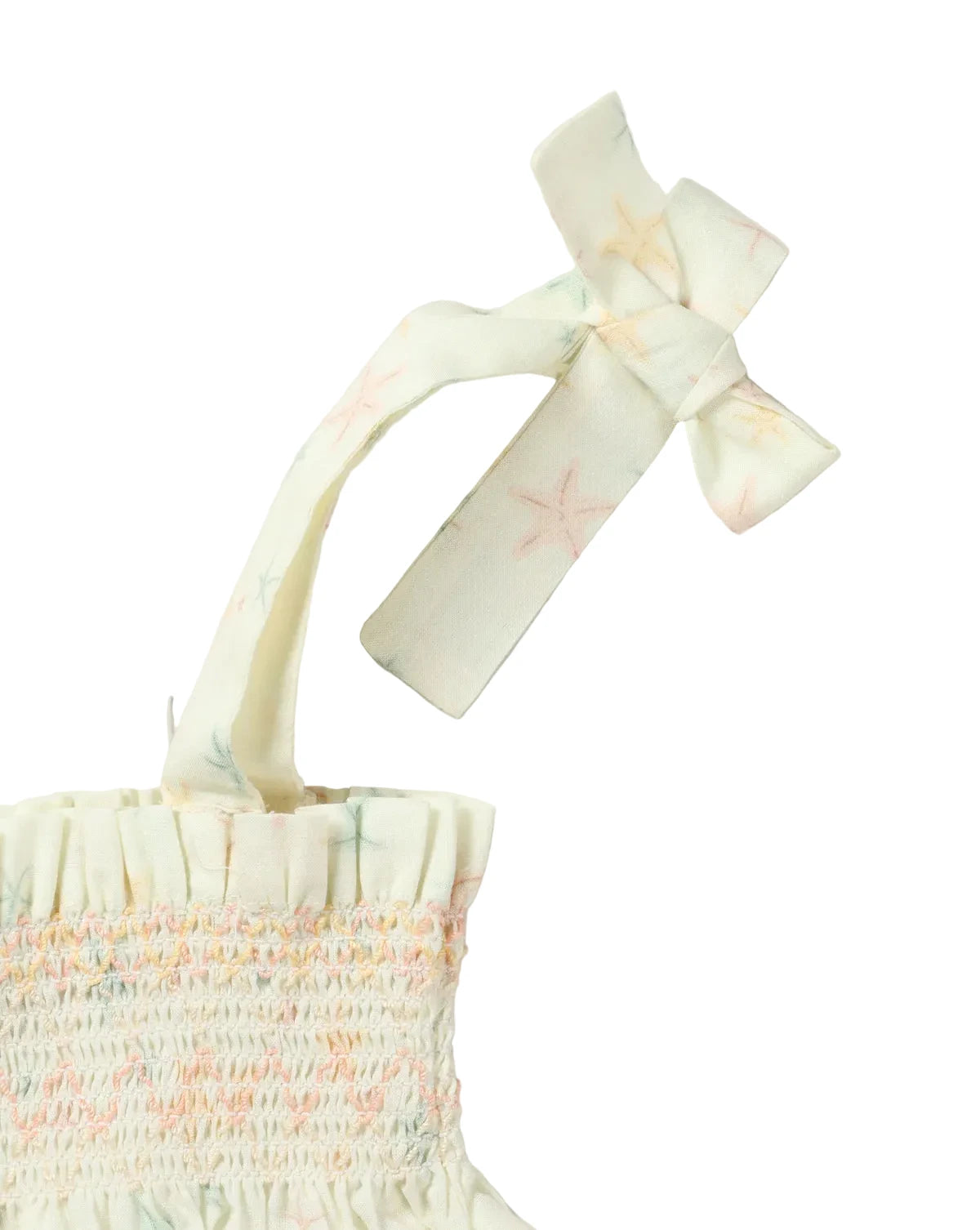 The Audrey Baby Romper combines vintage charm with everyday comfort. Crafted from soft, breathable printed cotton cambric, it features delicate smocking, adjustable tie-up straps, and a relaxed fit for ease of movement. The star fish print adds a touch of whimsy, making it perfect for playdates and special outings.