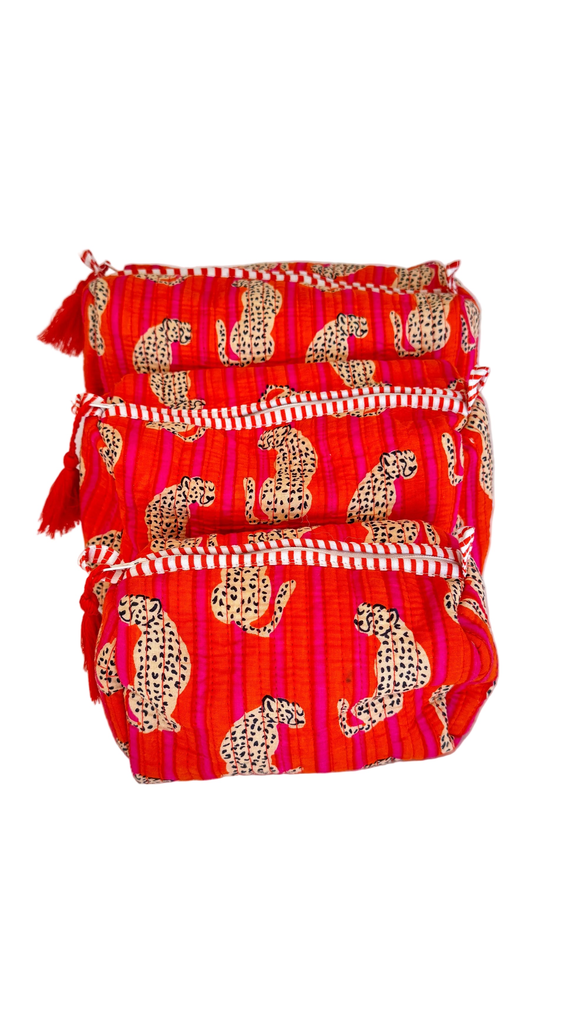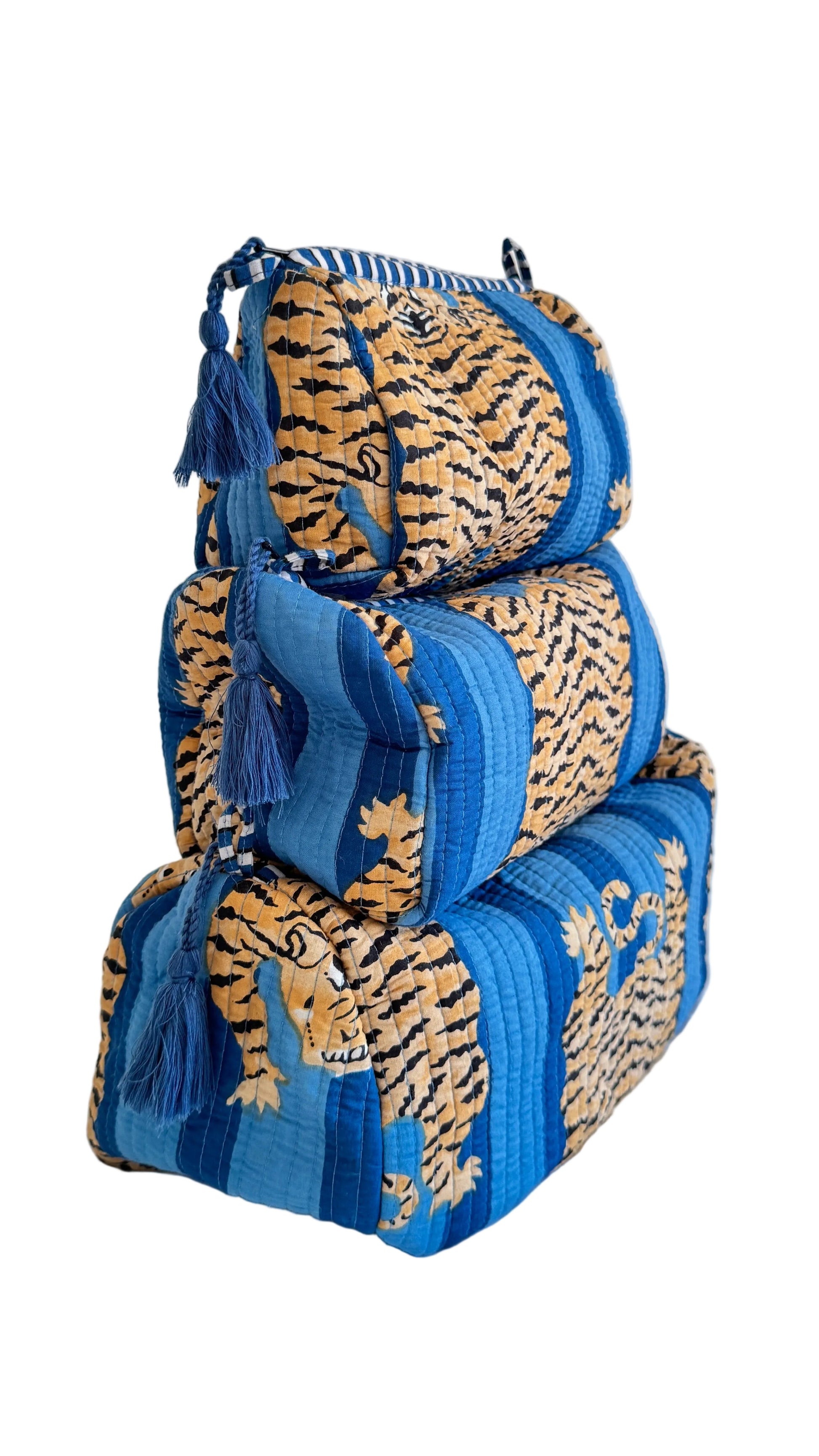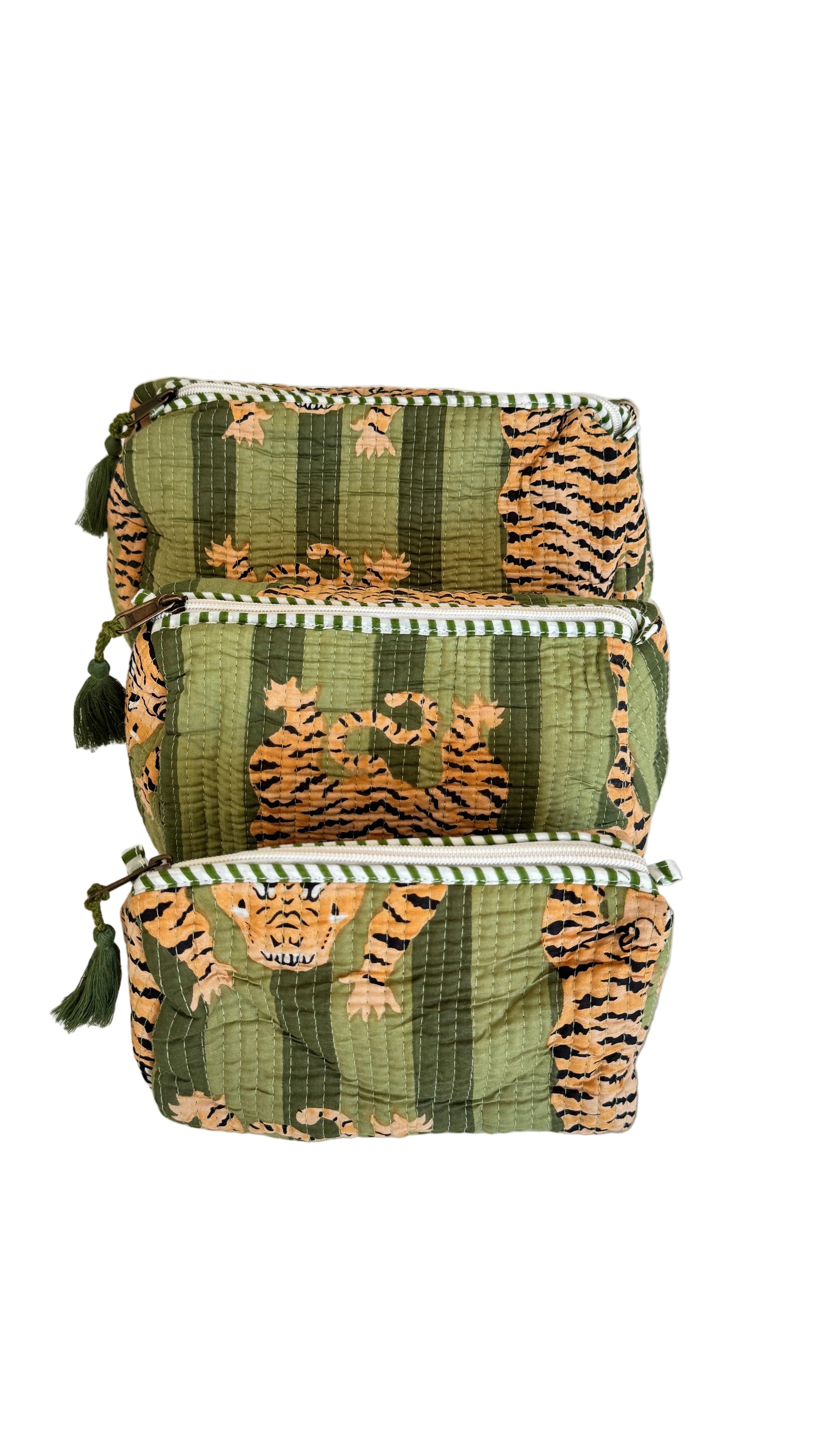 Brighten up your routine with these handmade 3-piece cosmetic sets designed to keep your essentials organized in bold, beautiful style. Featuring three coordinating bags in varying sizes, these various sets showcases beautifully 100% cotton prints quilted in India. Perfect for storing makeup, skincare, toiletries, or travel must-haves, each bag is lightweight, durable, and easy to pack!